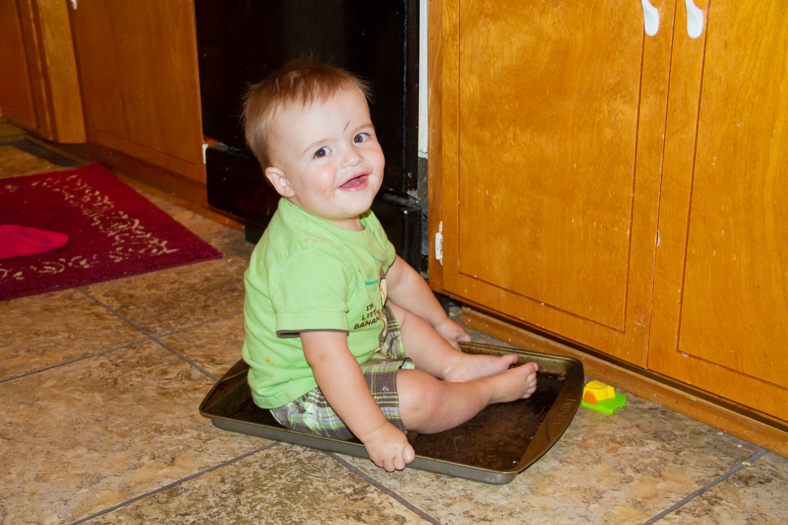 He started throwing mini tantrums last week. It is quite funny and really difficult not to laugh when he throws a fit. He starts to cry, then collapses on the carpet, groveling his face and boogers into the floor. Hil-ar-ious to the maximus. He also discovered he can scoot while sitting on a baking sheet. I love the looks of joy and accomplishment kids get when they discover something new. Makes motherhood that much sweeter.
