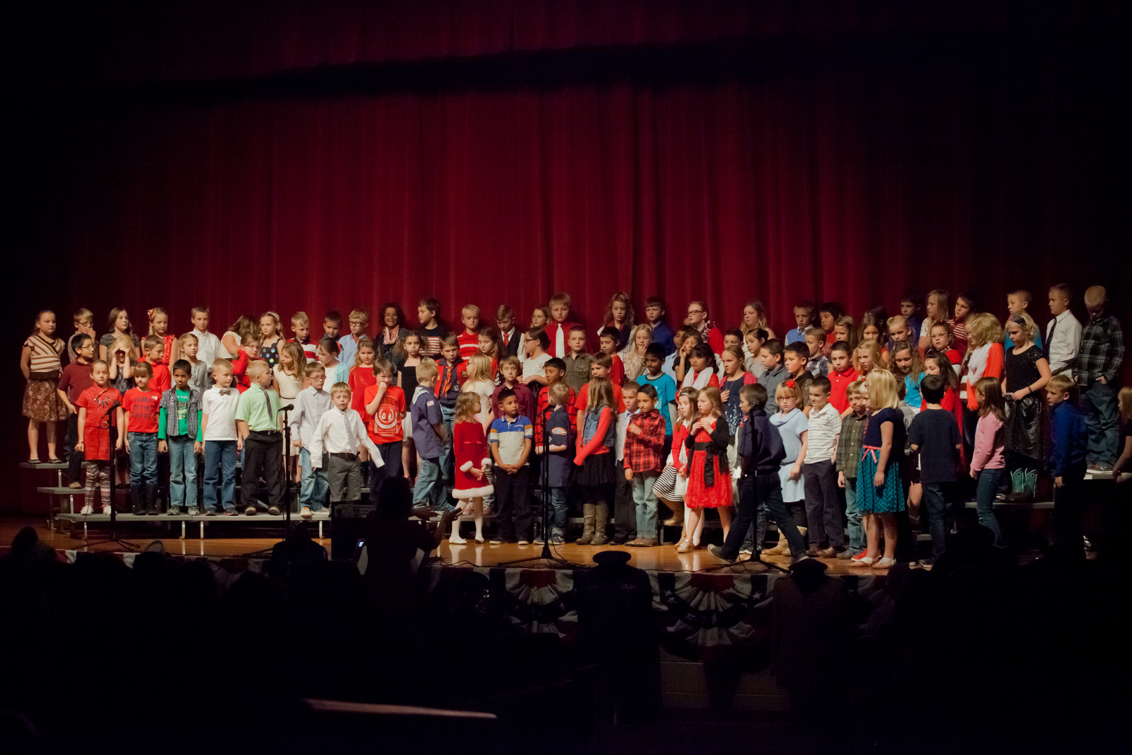 Thursday the Third Grade presented the Veteran's Day program they worked diligently on for a couple months. She was excited to pick out a Patriotic outfit, shoes, and hair. Justin walked her down to the High School at the appointed time. I came a bit later with the kids. The program started with two Veteran's uncovering a row of military uniforms set up in front of the stage. Each guy carefully unveiled the uniform and adjusted the cap and made sure the uniform looked sharp. It was quite moving! Amelia told me later that she had chills up her arms and cried during the unveiling. Each class paired with another class to sing 3-4 songs, Amelia's group went last. Everett was totally dancing to a funky song about uniting as a country put to 70s jive music. Amelia's class sang one of the best songs of the evening, American Tears. It was put to a slide show of Veteran's who served from the kid's families. Grandpa Lane's photo showed up 3 times, plus the photo of Amelia, Uncle John, and I was the only photo that showed a child in the grade with a Veteran. The boys were excited to see photos of Uncles John, Joe, and Jeff as well. Well played 3rd grade. I had to keep myself from smiling as Amelia relayed her feelings to us after the recital. She totally waved her hand to keep herself from crying. I took a video of her singing American Tears before the concert since she worked so hard learning that sing.
