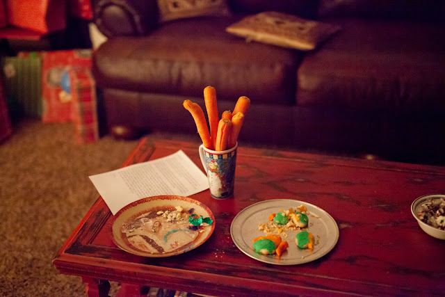Christmas Eve day was pretty exciting. Justin stayed home, he took the kids out for a couple hours so I could finish wrapping gifts. I slapped tape on the last gift moments before the crowd got back home. Evelyn loves to ride in Justin's truck. In the afternoon the kids shaped and cut cookies for Santa while I shaped bread bowls. The dang dough rounds did not rise into bowls, rather flat disks. I slapped the dough back in the kitchen aid and stirred more flour into the dough. We ended up eating clam chowder well after 6:30 pm, unheard of in these parts. Amelia set the table nicely, made juice, and decorated with candles. We ate delicious clam chowder by candle light as we talked about our favorite memories of the year and the Christmas season. Everett was quite impressed to eat food by candle light, he had a hard time eating because he was so excited. Amelia was in charge of gathering outfits for our nativity play. Right after dinner the kids iced their cookies for Santa. Since Rudolph hates carrots Amelia had the great idea to make carrot shaped cookie for the reindeer. We ended up reading Luke 2 several times so each kid could try out different characters. First scene Amelia was Mary, Justin was Joseph, Vader the donkey, Evelyn an angel, Phillip the shepherd, unicorn was a sheep, and Everett was the star, I was a wiseman. The kids were so cute! Evelyn was quite pleased to wear her Elsa dress for the evening. Innej dropped off a bag of PJs and a treat for the kids around 7 pm. She rang the doorbell then jingled her bells around the house. It was chaos! Soon the kids were all dressed up in warm PJs drooling chocolate down the fronts. Eventually, the kids fell asleep. Phillip was wound up tighter than a spring.