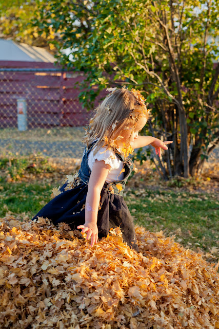 Friday the kids had no school. We visited a friend of mine, Angela Frerichs for the morning. She has a super awesome park right in their yard! The kids played, got dusty, rode tractors, scooters, battery operated cars, and even got to ride Zip the horse. Evelyn was quite fascinated with the training potty Angela had outside by the play ground. She used the potty several times just because it was super amazing. Some days, now more than ever, I wish we lived in the country. The kids can play, we can collect junk for them to play with, and let them fend for themselves outside in the fresh air. Country living is something my kids need. Animals to care for, great and elaborate games to concoct, and lots of stuff to tinker with. We met Justin for lunch at Subway. The kids played on the stationary train car for sometime before and after lunch. Amelia spent the rest of the afternoon with Katelyn at her home. Phillip had his friend Lyrah over to play at our home. After work Justin whipped out the leaf blower to amass a decent leaf pile for our annual leaf party. I grabbed my camera, Justin manned the rake, and the kids jumped and ran until we were all itchy from leaves in our clothes. I even got to play in the leaves for a bit!
