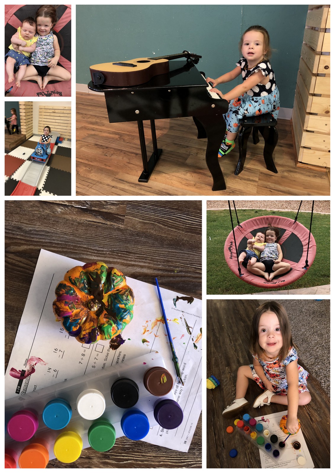 Josie noticed the new pumpkin displays are out. Each time we pass one she crones lovingly at the tiny baby pumpkins. I got her a cute baby pumpkin to take care of! She enjoyed painting her pumpkin with some kid paints. Her vocal description as she changed paint colors and described what she was doing had me giggling. Evelyn came home and washed off all the paint, stinker! I cared more than Josie did. On Friday I took Josie to "Giggles" and indoor toddler play ground. Josie walked in and did not stop exploring for a good two hours. Her eyes were huge as she surveyed the place, deciding what to do first was a struggle. Her favorite activities were: riding the roller coaster Thomas Train, the wooden play structure, the play house, and the shopping carts. Two other gals from my ward were also there so we had a nice time to talk. I took some cute photos of Gabi, who just turned 2 months old and little Liberty again. Sister Payne found some of her mother's baby clothes, bonnets, shoes, jewelry, etc she wanted to put Liberty in. Totally up my alley! Gotta love that vintage vibe. Josie found a green stamper during the session. She marked up herself when I was not paying attention. Ha ha ha. We also watched Leo a couple times this week, along with Gabi we were loaded up full with little kiddos.